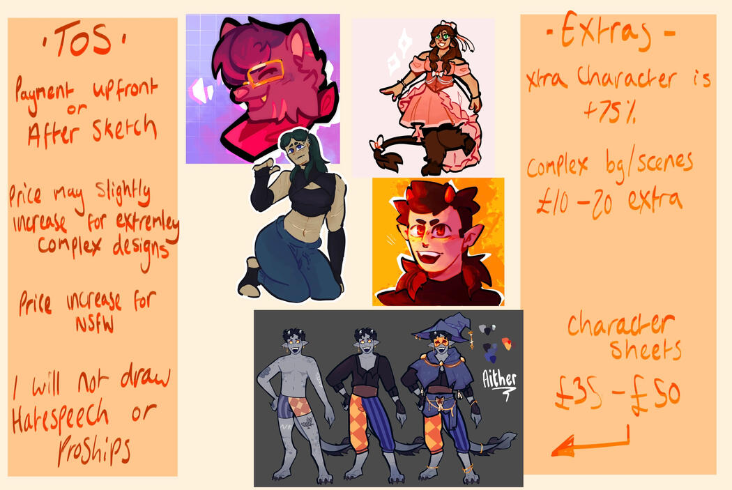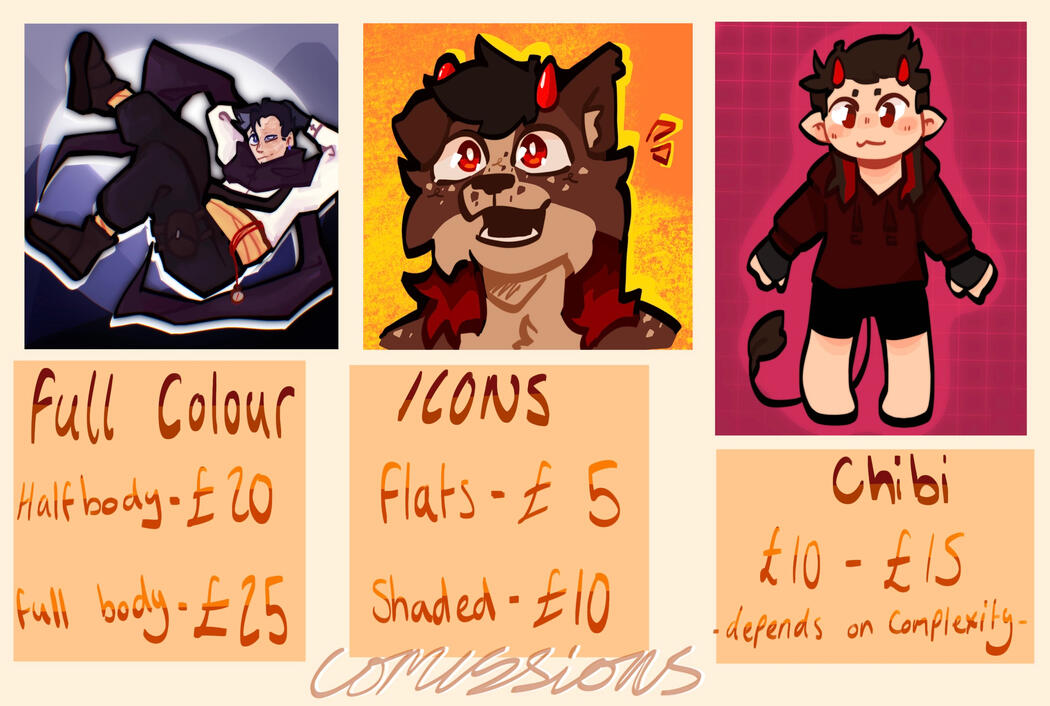My commissions page! If you are interested in a commission from me please reach out on any of my socials or through my email [email protected]Payment is Via PayPal Or Ko-fiMore examples of my work can be found in my portfolio below this